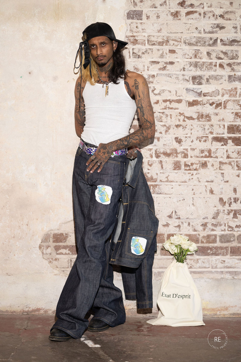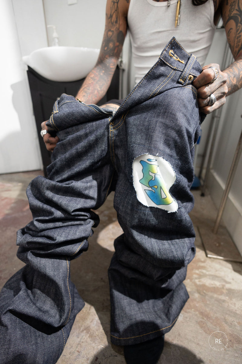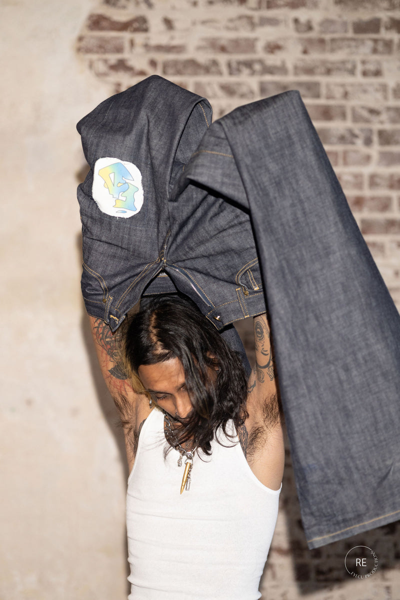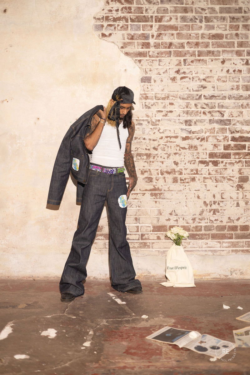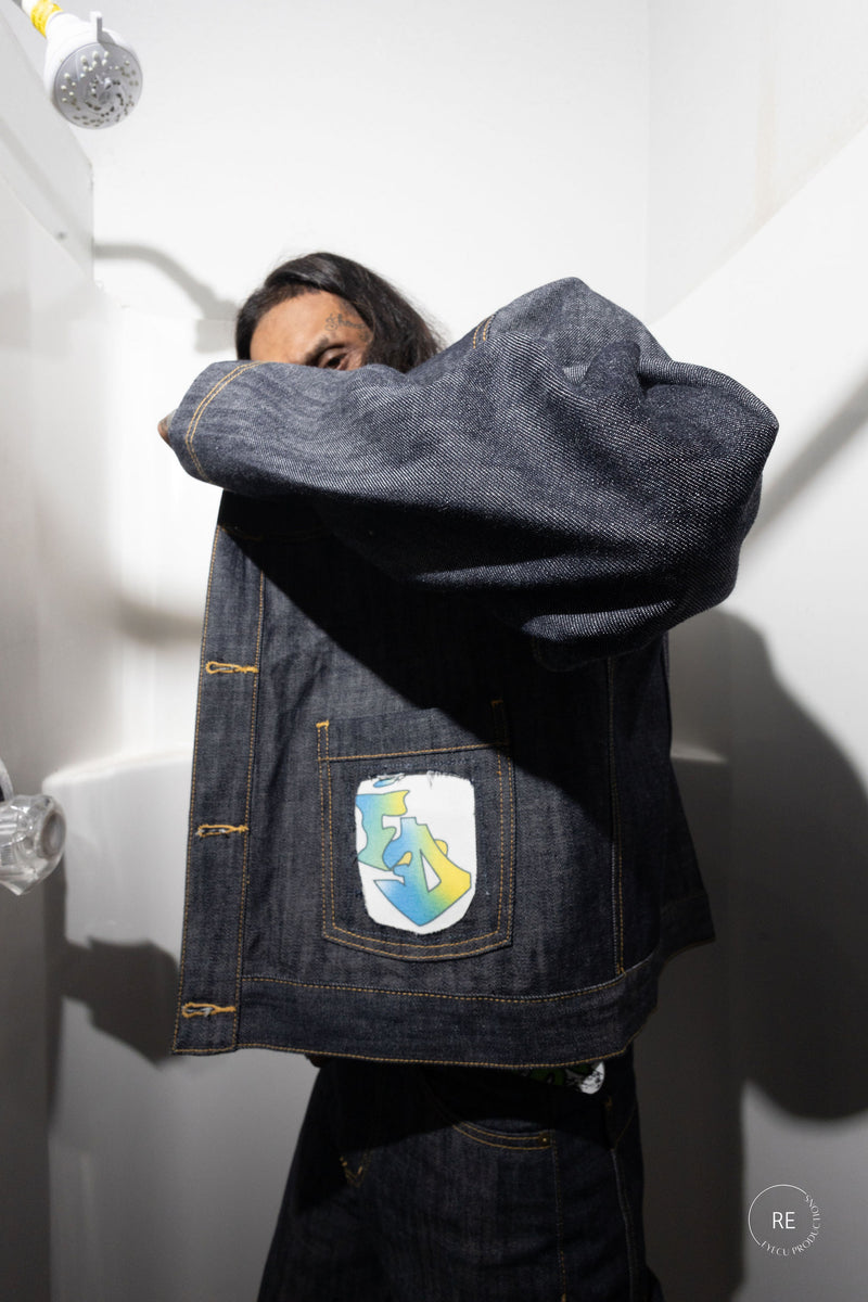 High-quality selvedge denim, DTG graffiti prints, flared pants, cropped jacket bright colors that speak to the graffiti walls uptown and the energy on the block.